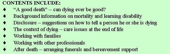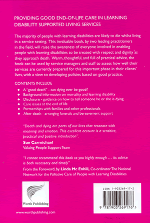 The majority of people with learning disabilities are likely to die whilst living in a service setting. This invaluable new book, written by two leading practitioners in the field, will raise the awareness of everyone involved in enabling people with learning disabilities to be treated with respect and dignity as they approach death. Full of practical advice, the book can be used by service managers to assess how well their services are currently prepared for this important phase in their clients’ lives, with a view to developing policies based on good practice.