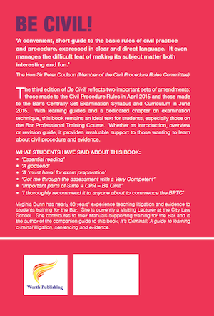 ‘Be civil: A guide to learning civil litigation and evidence’ 3rd Edition by Virginia Dunn MA Barrister 2016 ISBN 9781903269350 RRP: £39.00 |